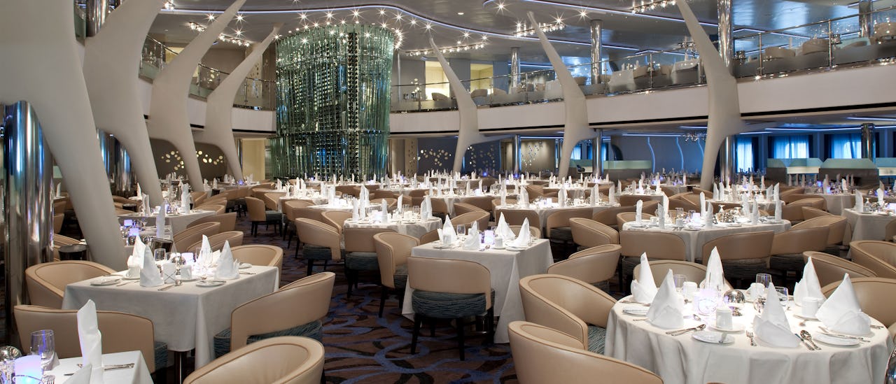 Celebrity Cruises är kända för sina matupplevelser. Fyra restauranger ingår i kryssningsbiljetten och övriga kostar extra. Den eleganta huvudmatsalen är en modern tolkning av det glamorösa 20-talet.